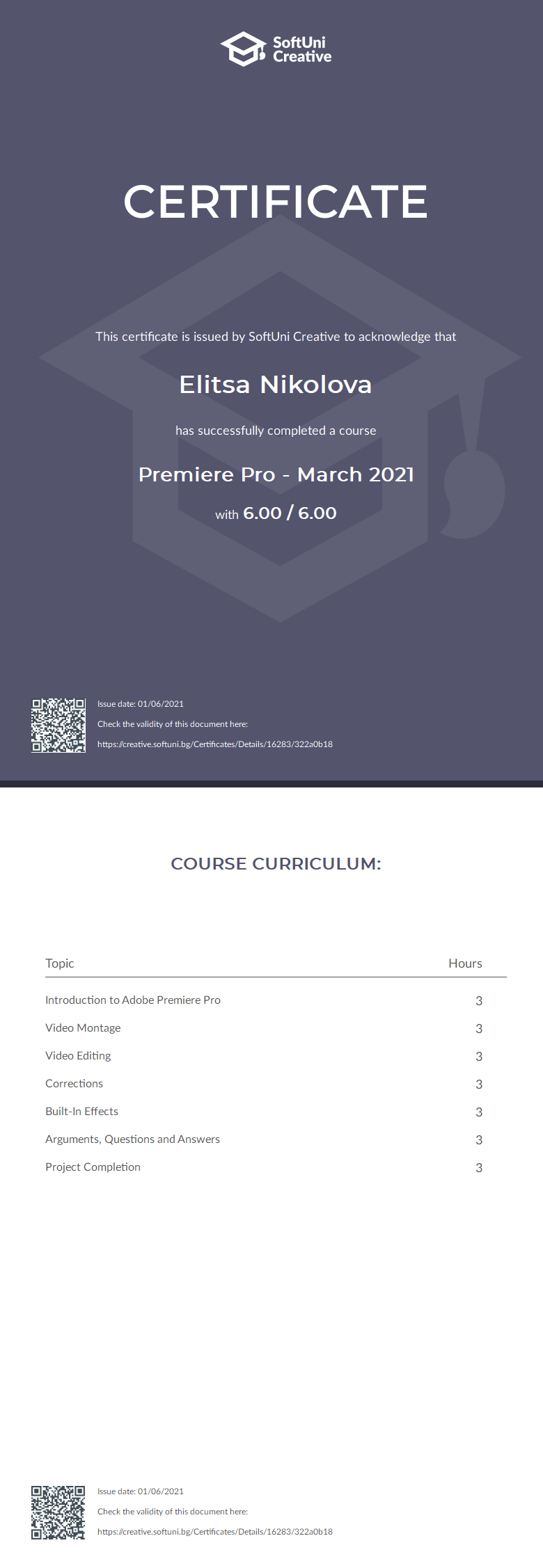 Сертификат - Premiere Pro - March 2021 - SoftUni Creative