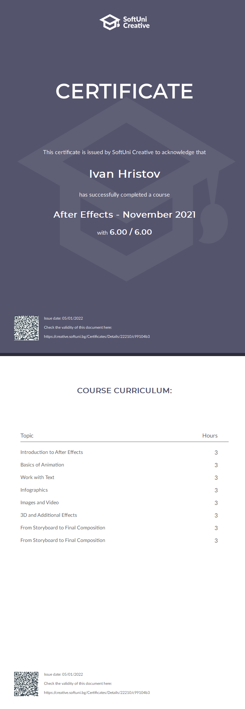 Сертификат - After Effects - November 2021 - SoftUni Creative