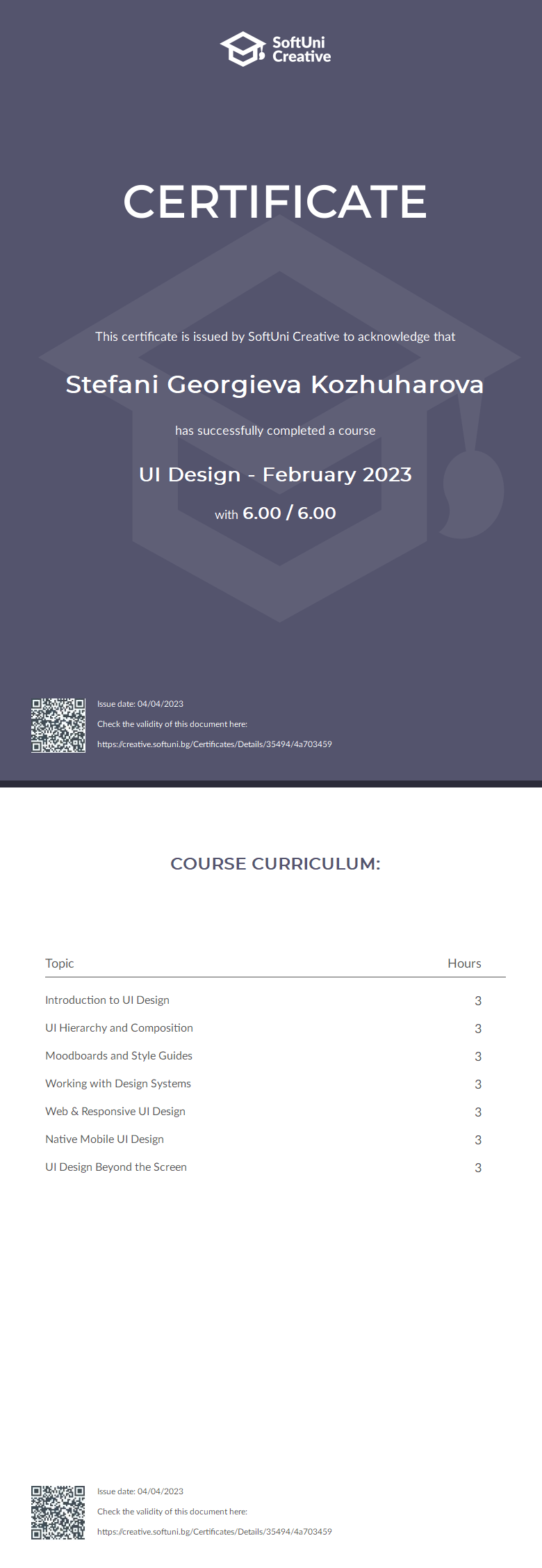This certificate is issued by SoftUni Creative to acknowledge that