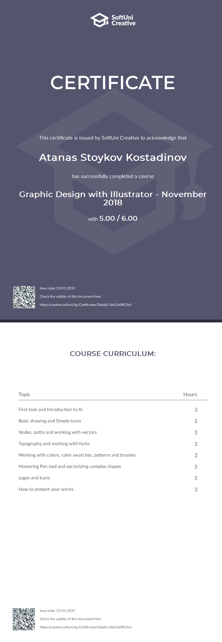 Сертификат - Graphic Design with Illustrator - November 2018 - SoftUni Creative