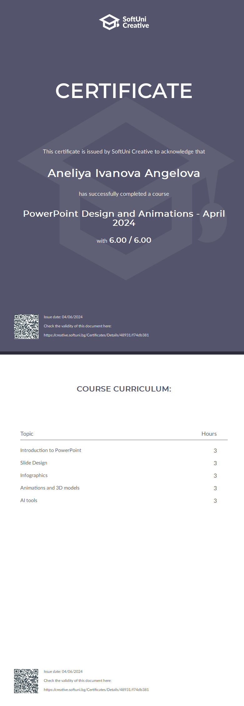 Сертификат - PowerPoint Design and Animations - April 2024 - SoftUni Creative